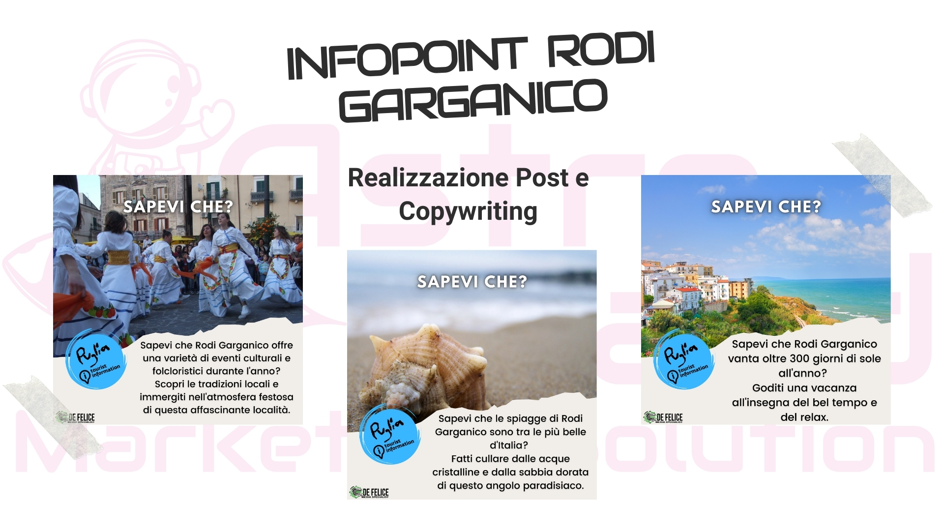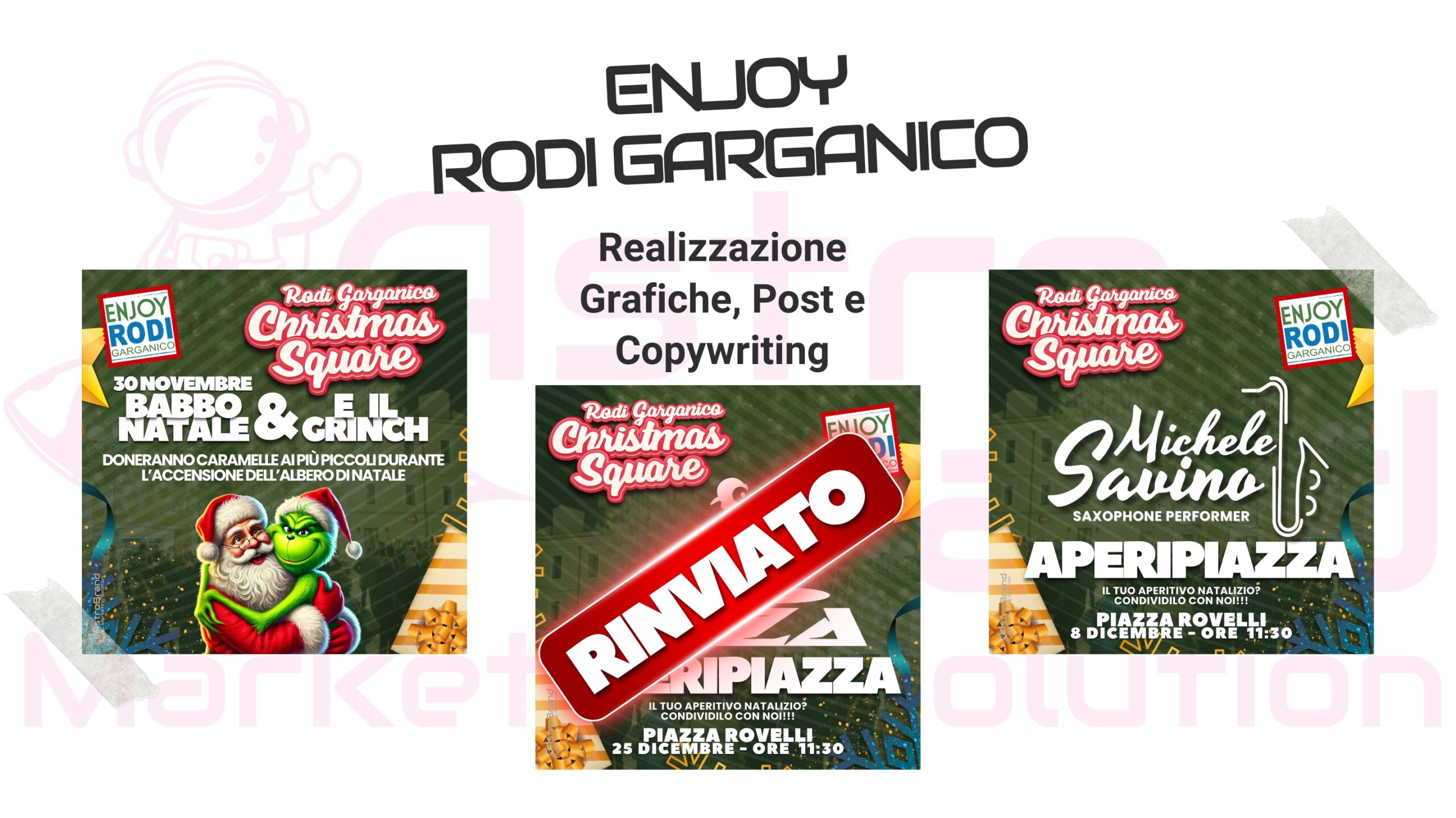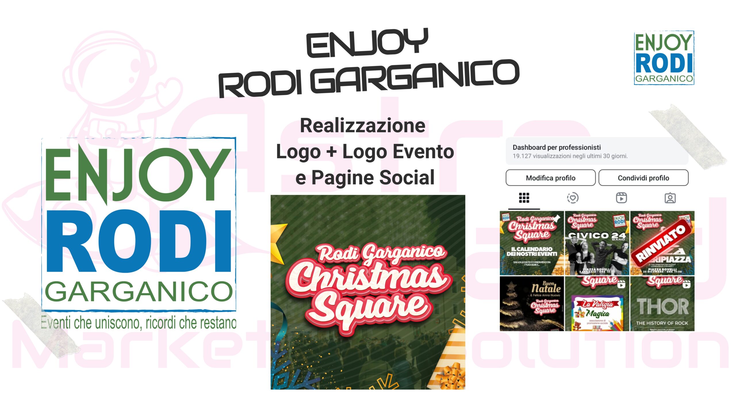 - Creazione e ideazione Evento - Realizzazione Brand Identity - Social Media Strategy - Processi Comunicativi - Realizzazioni Grafiche Elementi per Punto Vendita - Realizzazione Video Comunicativi - Aggiornamento Logo - Realizzazione e Stampa di Manifesti e Materiale Promozionale - Creazione Lotteria con Ricavato in Beneficenza