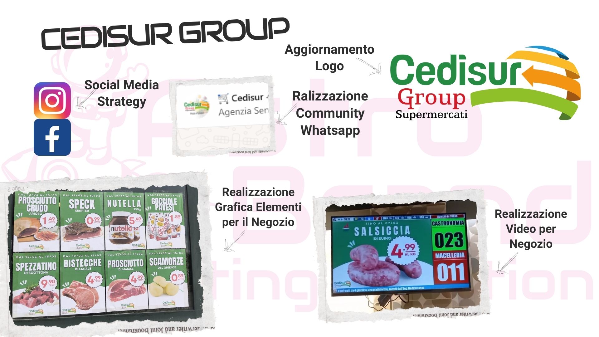 - Realizzazione Brand Identity - Social Media Strategy - Processi Comunicativi - Realizzazioni Grafiche Elementi per Punto Vendita - Realizzazione Video Comunicativi - Aggiornamento Logo - Realizzazione e Gestione Community Whatsapp
